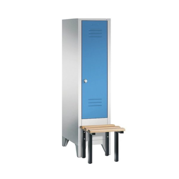 One shelf inside each compartment, including a sturdy coat rail with three anti-twist sliding hooks, locker base at the rear with large air outlet, on 100 mm high plinth, with plastic glides, set back at the front and with air outlet at the top, doors with stop dampers and closed side profiles, with ventilation hole pattern at the top and bottom and embossed label frame, door suspension in pivot bolts.