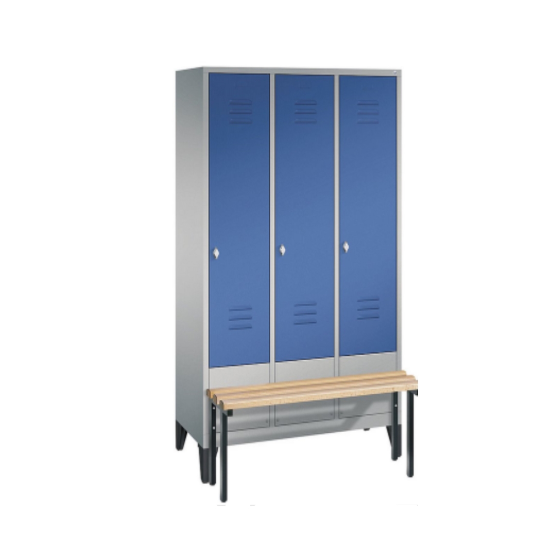 One shelf inside each compartment, including a sturdy coat rail with three non-rotating sliding hooks, locker base at the rear with large air outlet, on a 100 mm high plinth, with plastic glides, set back at the front and with air outlet at the top, doors with bumpers and closed side profiles, with ventilation hole pattern at the top and bottom and embossed label frame, door suspension in pivot bolts.