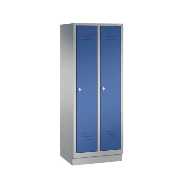 One shelf inside each compartment, including a sturdy coat rail with three non-rotating sliding hooks, locker base at the rear with large air outlet, on a 100 mm high plinth, with plastic glides, set back at the front and with air outlet at the top, doors with bumpers and closed side profiles, with ventilation hole pattern at the top and bottom and embossed label frame, door suspension in pivot bolts.