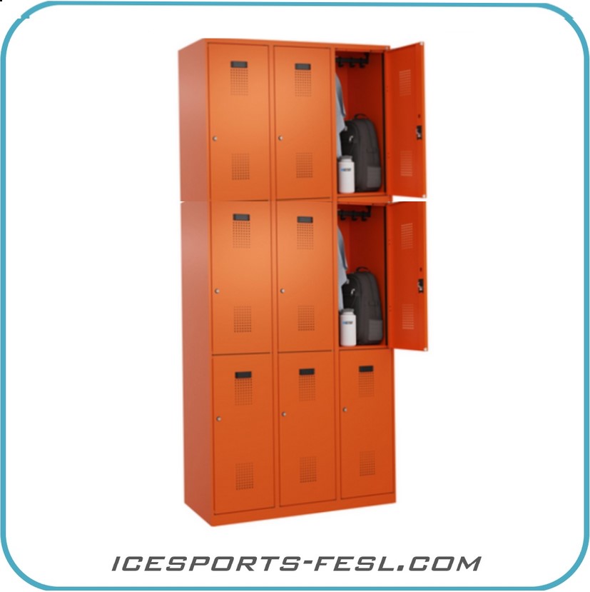 Stabiler und langlebiger Eishallen Schliessfach-Schrank mit drei übereinander angeordneten Abteilen (Breite je Abteil 300mm). Der Korpus besteht aus einer stabilen Stahlkonstruktion mit einer hochwertigen Einbrennbeschichtung für eine hohe UV- und Korrosionsbeständigkeit. Somit ist eine besonders lange Lebensdauer im Einsatzbereich einer Eissportanlage gewährleistet.