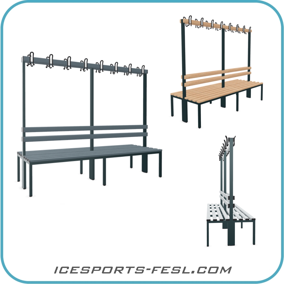 Die freistehende, zweiseitige Garderobenbank Eisarena ist speziell für den dauerhaften Einsatz in Umkleideräumen, Sportkabinen und Anziehbereichen in Eishallen oder Eisstadien konzipiert. Mit einer eigens für Eissportler angepassten Sitzhöhe von 520 mm erfüllt die IF-PRO Garderobenbank höchste Anforderungen an Komfort und Funktionalität. Die TÜV-geprüfte Bank kombiniert eine stabile Vierkant-Stahlrohr-Konstruktion mit Rückenlehne, eine Garderobenleiste mit 4-8 Doppelhaken (je nach Breite) sowie einen hohen Sitzkomfort.